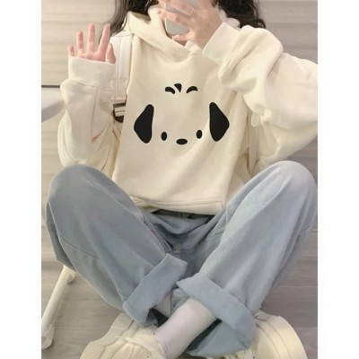 Japanese Style Extra Velvet Beige Hooded Sweatshirt Female New Arrival Oversize Milk Huhoo Couple Wear