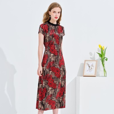 Red large flower improved cheongsam, long slim fitting traditional Chinese style skirt