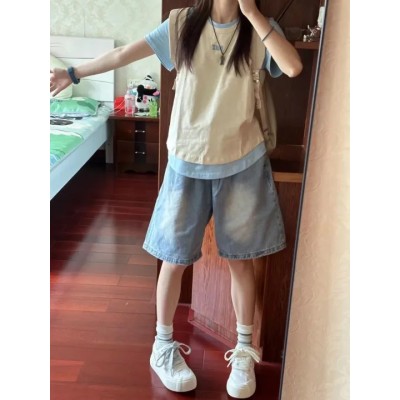 retro denim shorts for women loose and versatile high-waisted slim straight-leg pants
