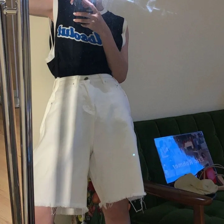 retro denim shorts for women loose and versatile high-waisted slim straight-leg pants